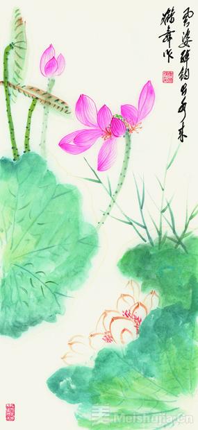 《风姿绰约出水来》是姚梅梅的荷花系列之一。这幅画采用了工笔和写意的结合。用工笔勾勒花瓣,线条流畅有力,突出荷花的细腻美感。粉色的花瓣真的很美很可爱!微风吹来,更是优雅。树叶采用写意,凸显生机和千秋天气。叶子特意涂上了翠绿色,让它们看起来更加生动艳丽。让我们想想翡翠的美丽和高贵的精神。
